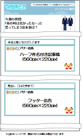 著名なメルマガ発行者が質問に答える形式のユニークなオフィシャルマガジン! 堀江貴文さん等注目を集める著名人の回答が精読率・広告効果を高めます! 配信対象カテゴリ 全カテゴリ配信 想定配信部数:約4,000,000部 配信日:毎週金曜日 入稿締切り日:3営業日前の正午 【広告メニュー】 ハーフ件名付き記事稿、フッター広告