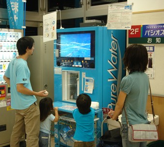 スーパーマーケットに設置される無料の水の自動販売機に、26インチ液晶モニターを設置したデジタルサイネージサービスです。利用者が給水ボタンを押すと、給水を受けている約30秒の待ち時間中に、音声付き30秒CM※が放映される仕組みの為、確実に視認させることができます。